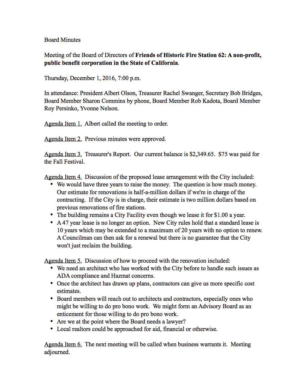 These are the minutes taken at the December 2016 meeting of the Friends of Historic Fire Station 62. They were approved March 9, 2017. Click on the page for a larger image.