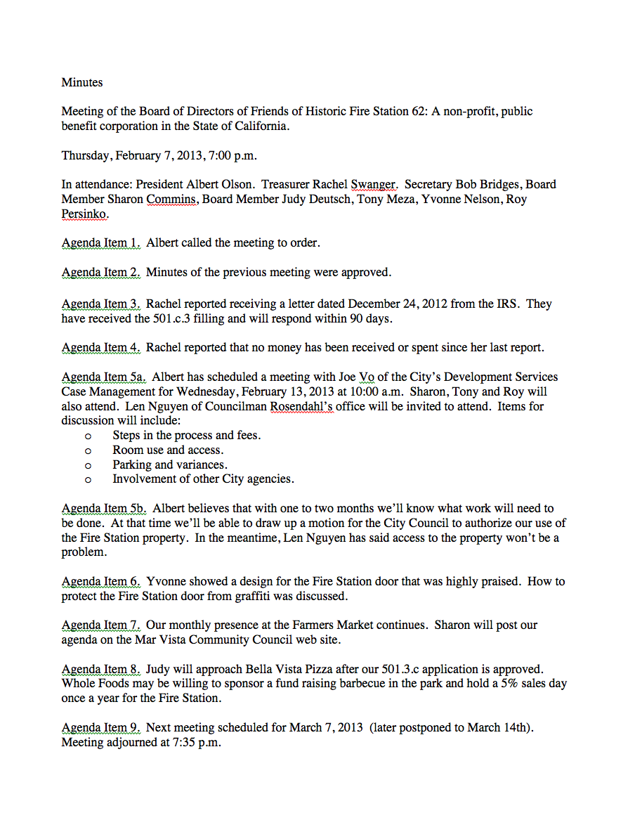 These are the minutes taken at the monthly meeting of the Friends of Historic Fire Station 62. Click on the page to see a larger image.