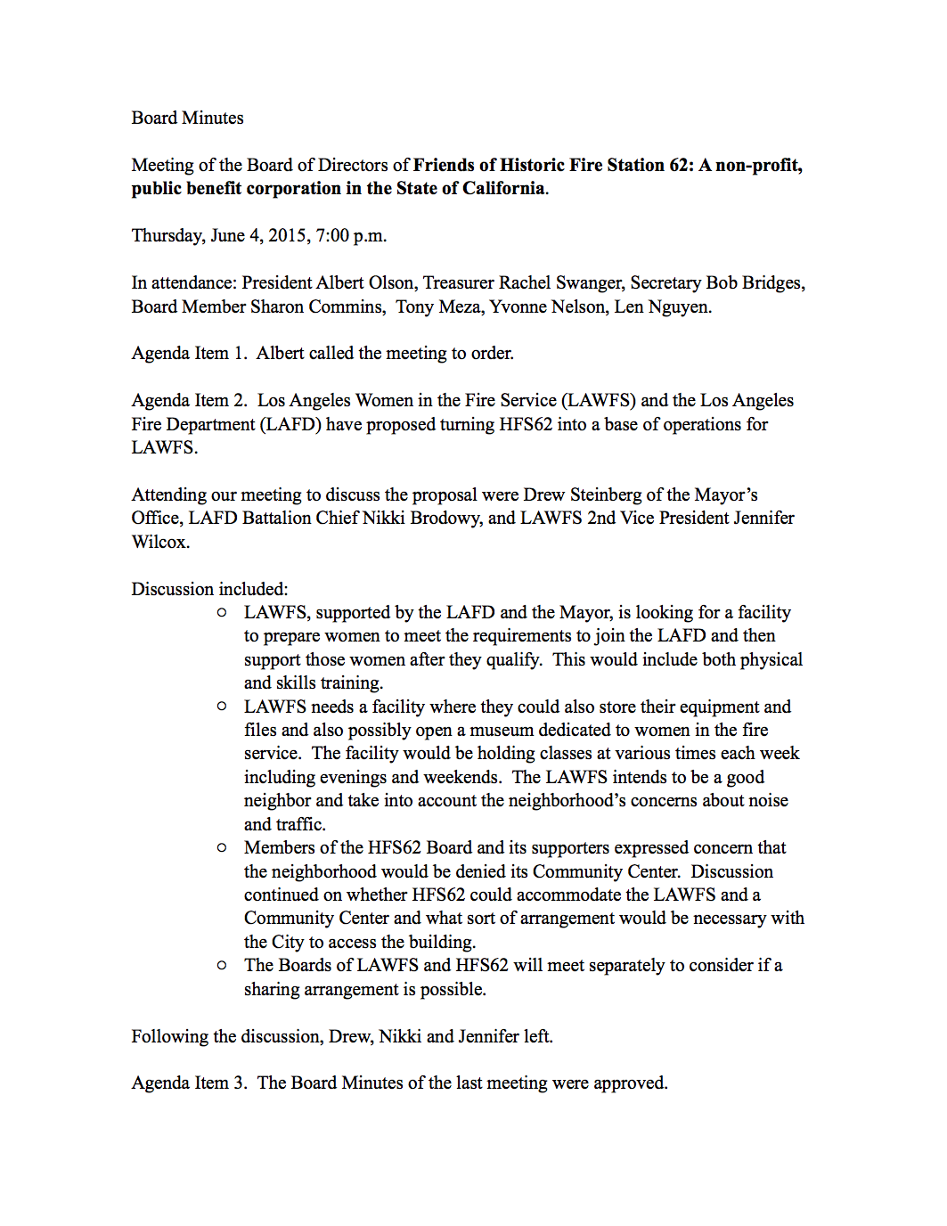 These are the minutes taken at the June meeting of the Friends of Historic Fire Station 62. They were approved August 7, 2015. Click on the pages for larger images.