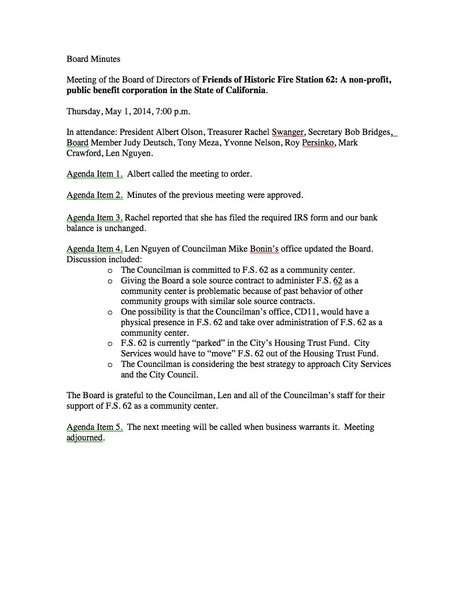 These are the minutes taken at the monthly meeting of the Friends of Historic Fire Station 62. They were approved July 21, 2014. Click on the page for a larger image.