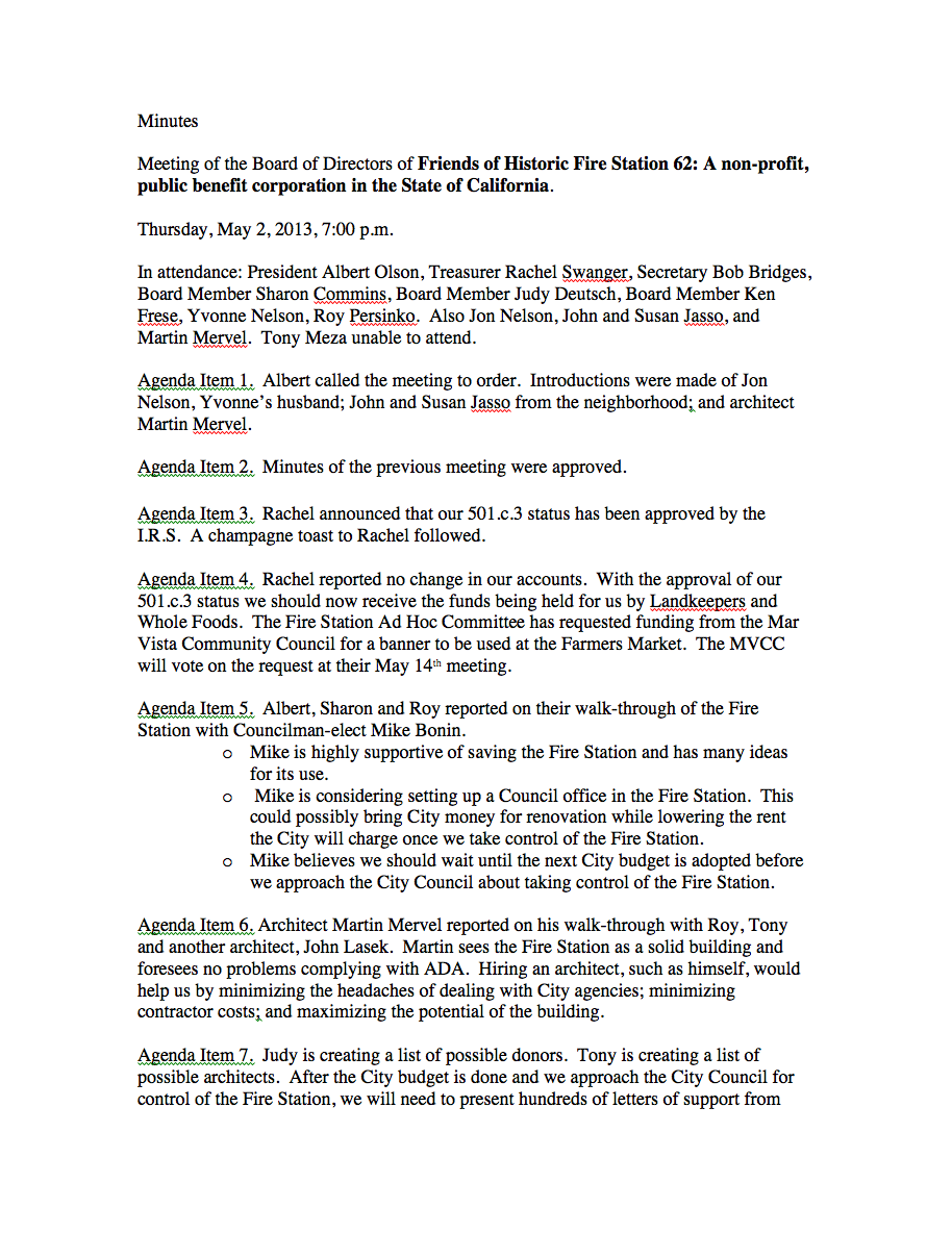 These are the minutes taken at the monthly meeting of the Friends of Historic Fire Station 62. Click on each page to view a larger image.
