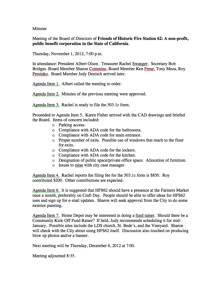 These are the minutes taken at the monthly meeting of the Friends of Historic Fire Station 62. Click on the page to see a larger image.